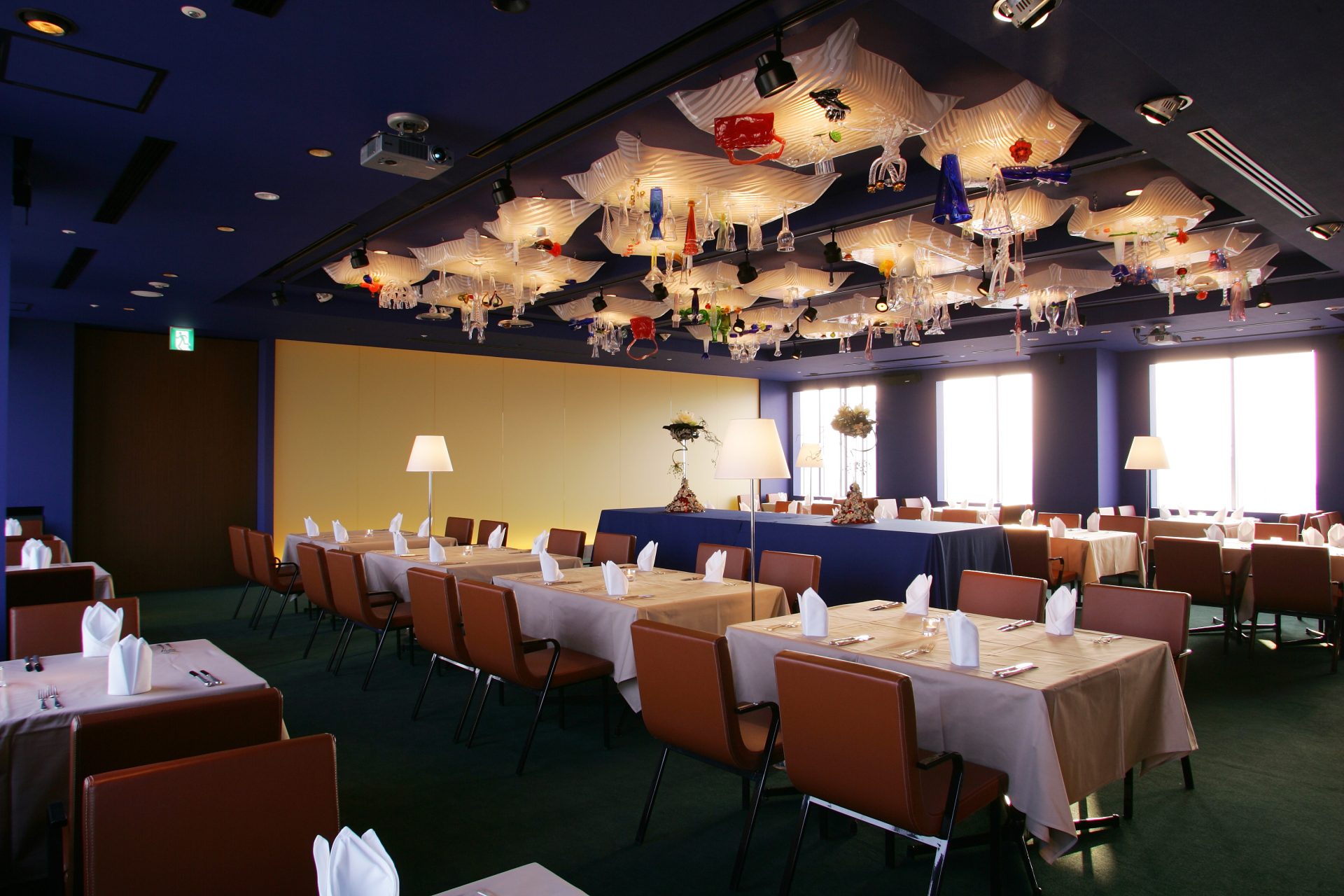 2007年にオリエンタルホテル広島のイタリアンレストランとしてオープンした「MOON GLOW(ムーングロー)」は内田繁氏が設計デザインを手がけた、夜空を思わせる深いブルーとイエローの壁面が印象的な空間です。その天井には、ボジェック・シーペック氏の作品が施され、ガラスで表現されたグラスやバッグの乗ったテーブルウェアが広がります。設置当時には、このために広島を訪れたシーペック氏自らが、ひとつひとつの作品をその場の閃きで組立て、内田氏とともに配置が行われました。