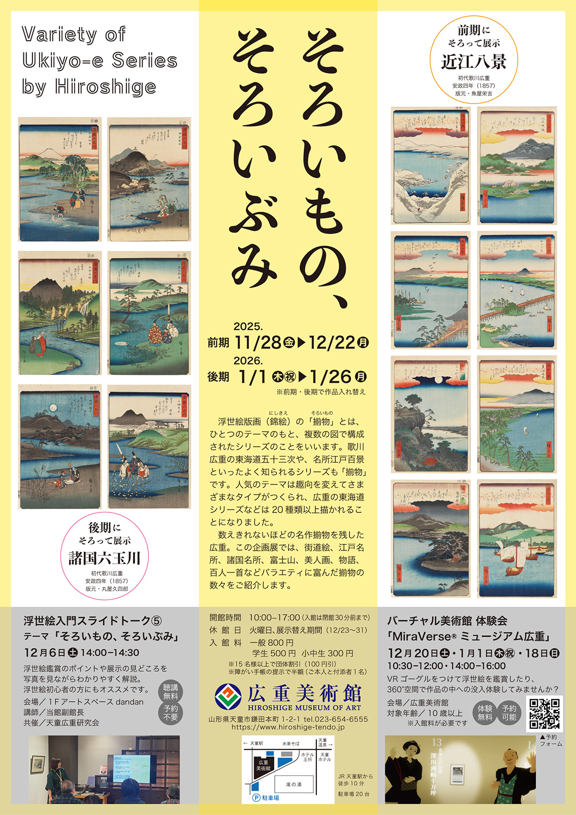 数えきれないほどの名作揃物を残した広重。この企画展では、街道絵、江戸名所、諸国名所、富士山、美人画、物語、百人一首などバラエティに富んだ揃物の数々をご紹介します。