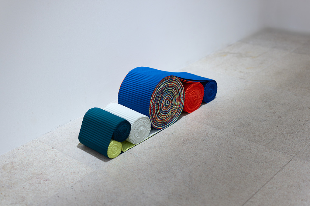 本展には、このプロセスとともに、衣服の試作の過程、そしてプリーツの可能性を紐解く作品群が並びます。引っ張る、巻き付ける、折りたたむなど、あらゆる行為が試され、素材のまだ見ぬ表情が現れました。彫刻的な作品はコレクションの衣服とは一見対照的な存在に思えますが、「日常着」の新しいあり方の研究という視点で有機的に連続しています。