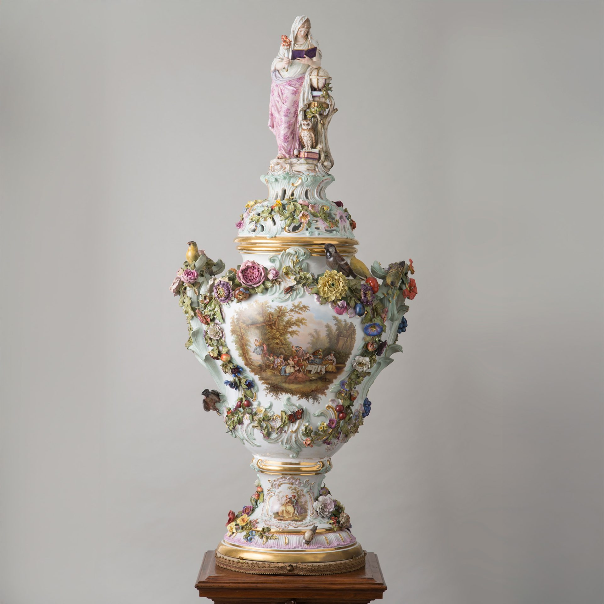 マイセン 《ポプリ壺「科学」》 19世紀後半/デザイン:1760年頃(壺の原型)、1895年頃(彫像) |デザイン:ヨハン・ヨアヒム・ケンドラー、エルンスト・アウグスト・ロイテリッツ、エマーリッヒ・アンドレイズン