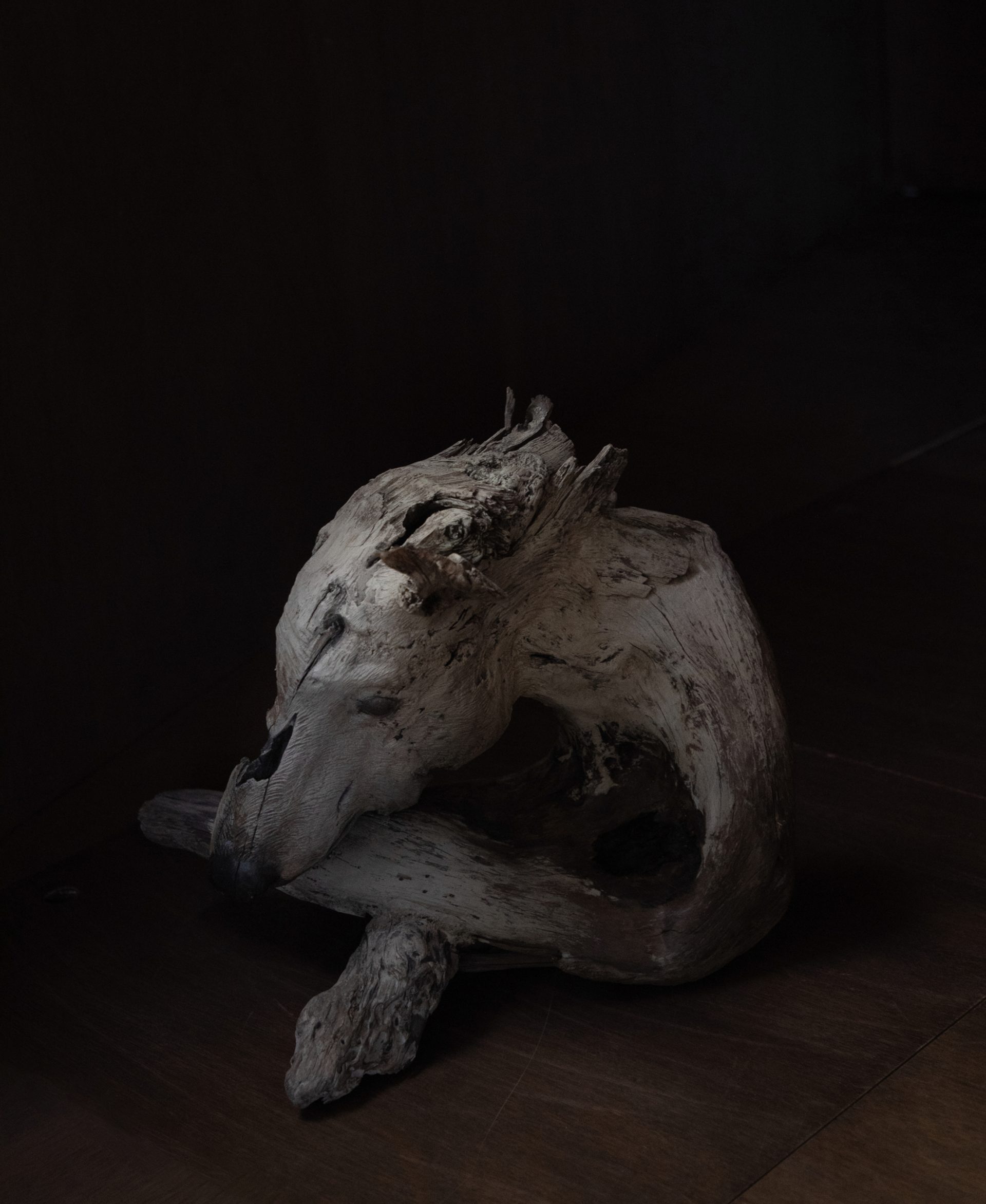 風化や経年による痕跡が残る素材で制作された作品は、生と死のあいだを行き交うようなニュートラルな佇まいをもち、静謐でありながらも確かな引力を放ちます。