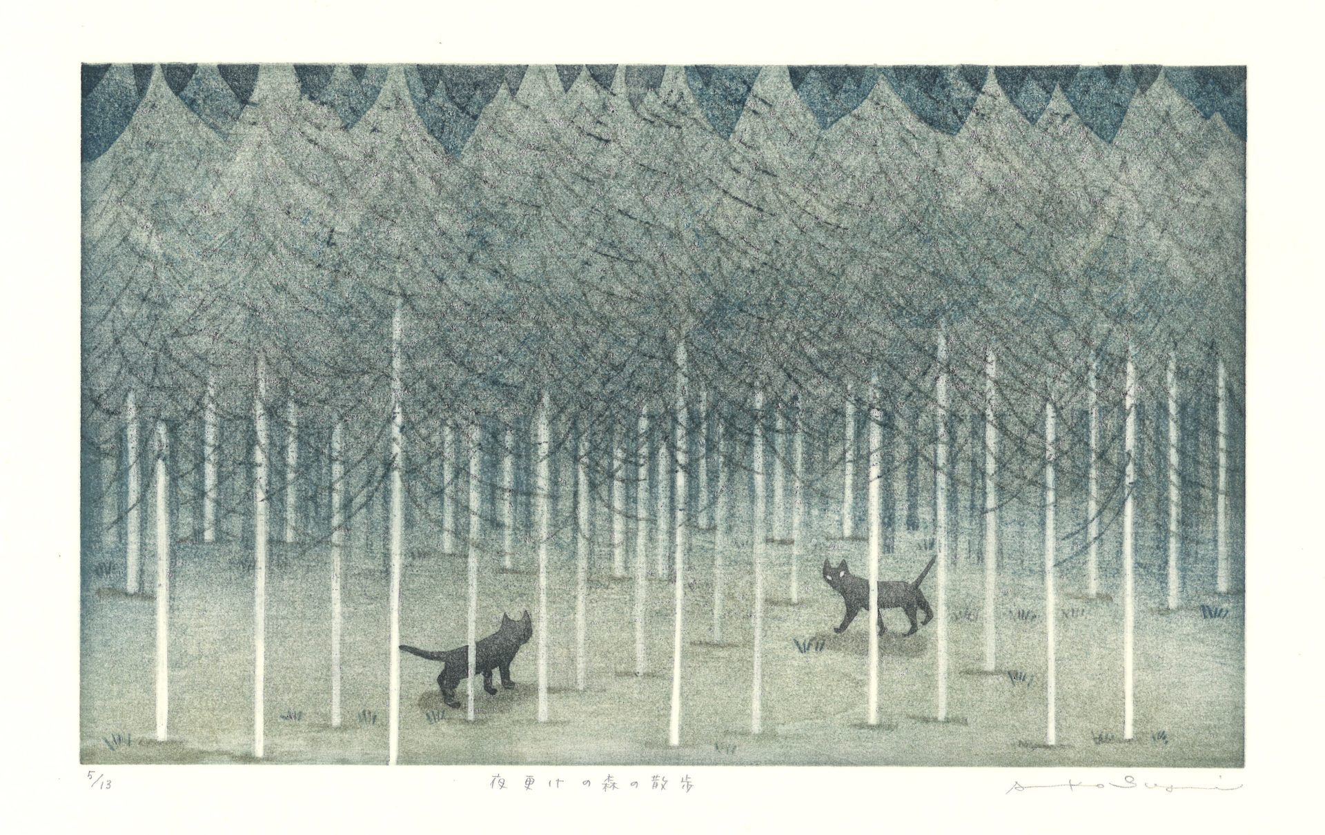 「料理好きな人が料理を作るように、私は木版画が好きなので木版画を作っています。楽しい気分で木版制作を始めたはずが、いつの間にか私は版木と闘うようになっていました。最近やっと木と和解することができ、今更ながら版木に助けてもらう機会がとても多いことに気がつきました。木は大地にある時と同じでとても心が広く、優しく接してくれます。私はそれに気付かず、木に怒ってばかりいました。これからは本当に自分が心から好きだと思える作品を木と共に仲良く作っていければと思っています。小さくても、派手さがなくても良いのです。ふと対話が生まれるような、心に染み入る作品とこれからの版画の世界でも出合い、観続ける事ができれば嬉しいです。」 (作家コメント『版画芸術120号』阿部出版より)