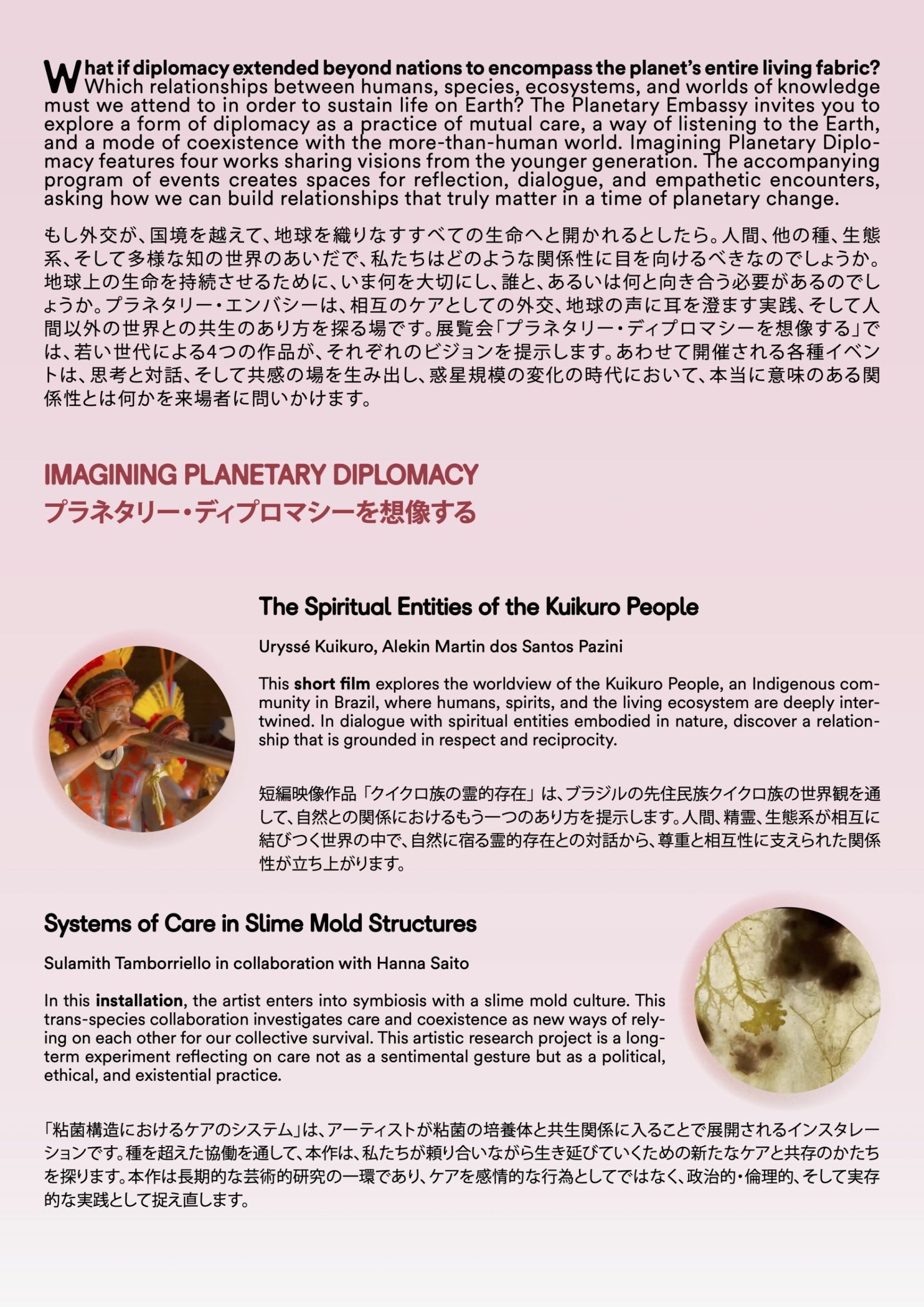 本展は、日本で開催される「プラネタリー・エンバシー」の一環であり、世界各地の若手研究者、イノベーター、アーティストを対象に行われた作品募集をもとに構成されています。世界中からの応募の中から、4つのプロジェクトが選出されました。