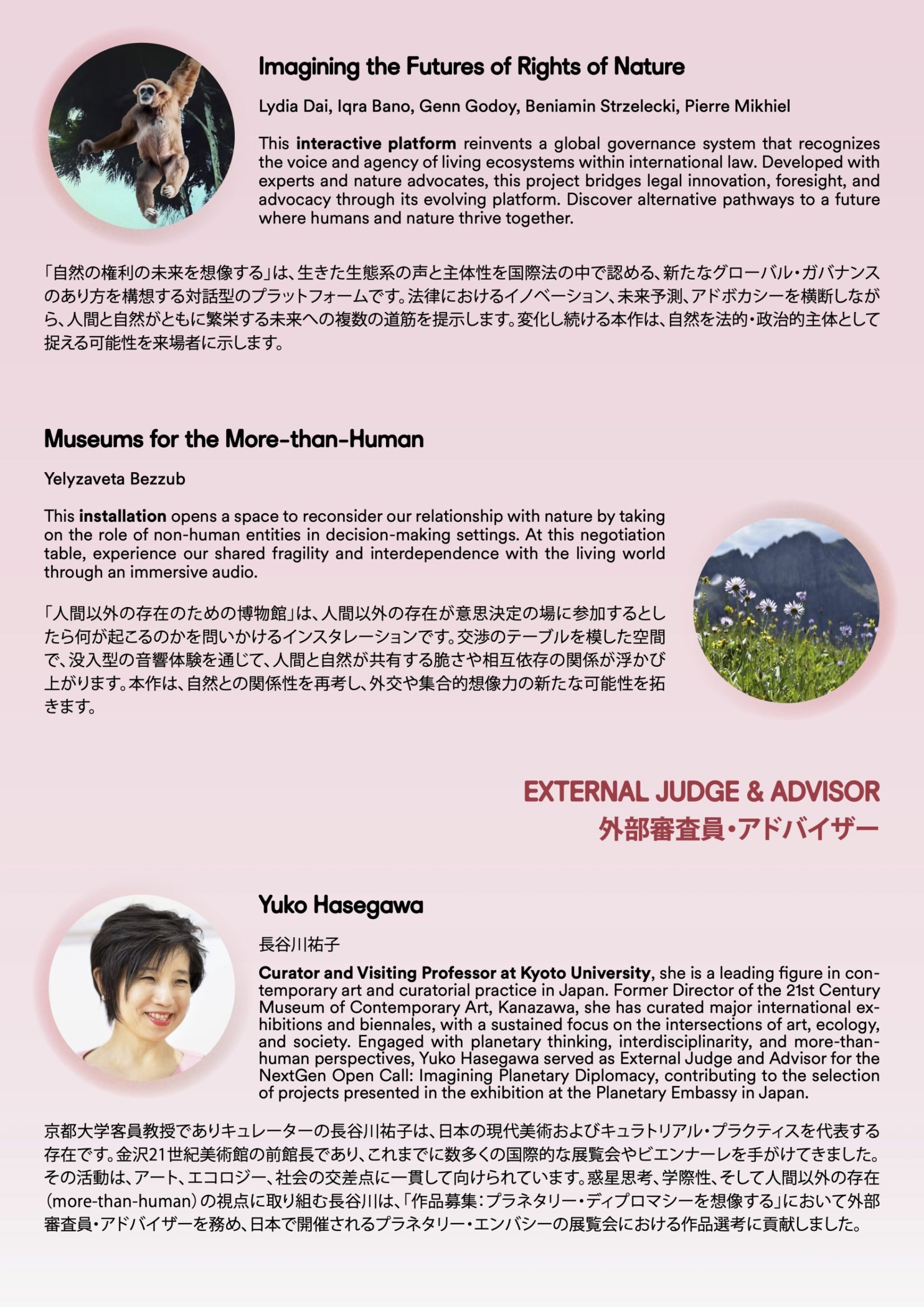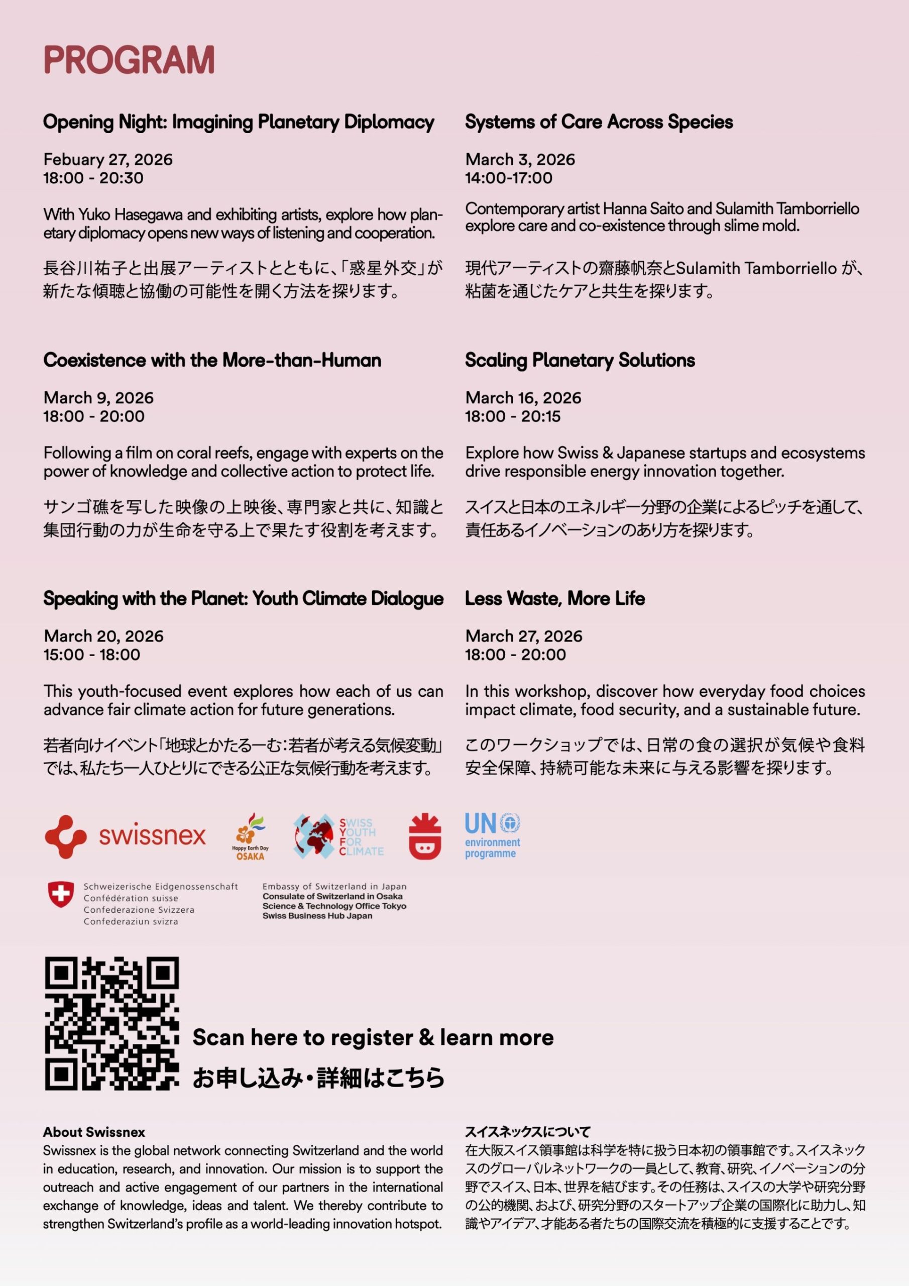 「プラネタリー・ディプロマシーを想像する」は、プレゼンス・スイスの支援のもと、スイスネックス・ジャパンが主催しており、地球の声により深く耳を傾け、相互のケアに根ざした共有の未来を思い描くことを来場者に促します。