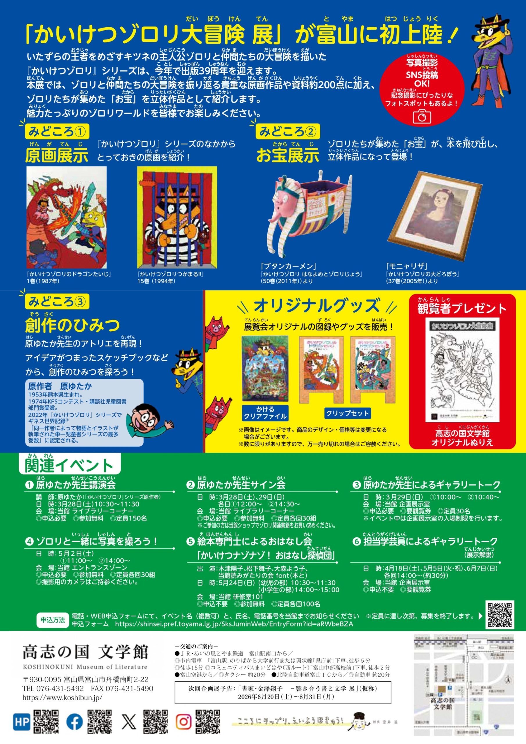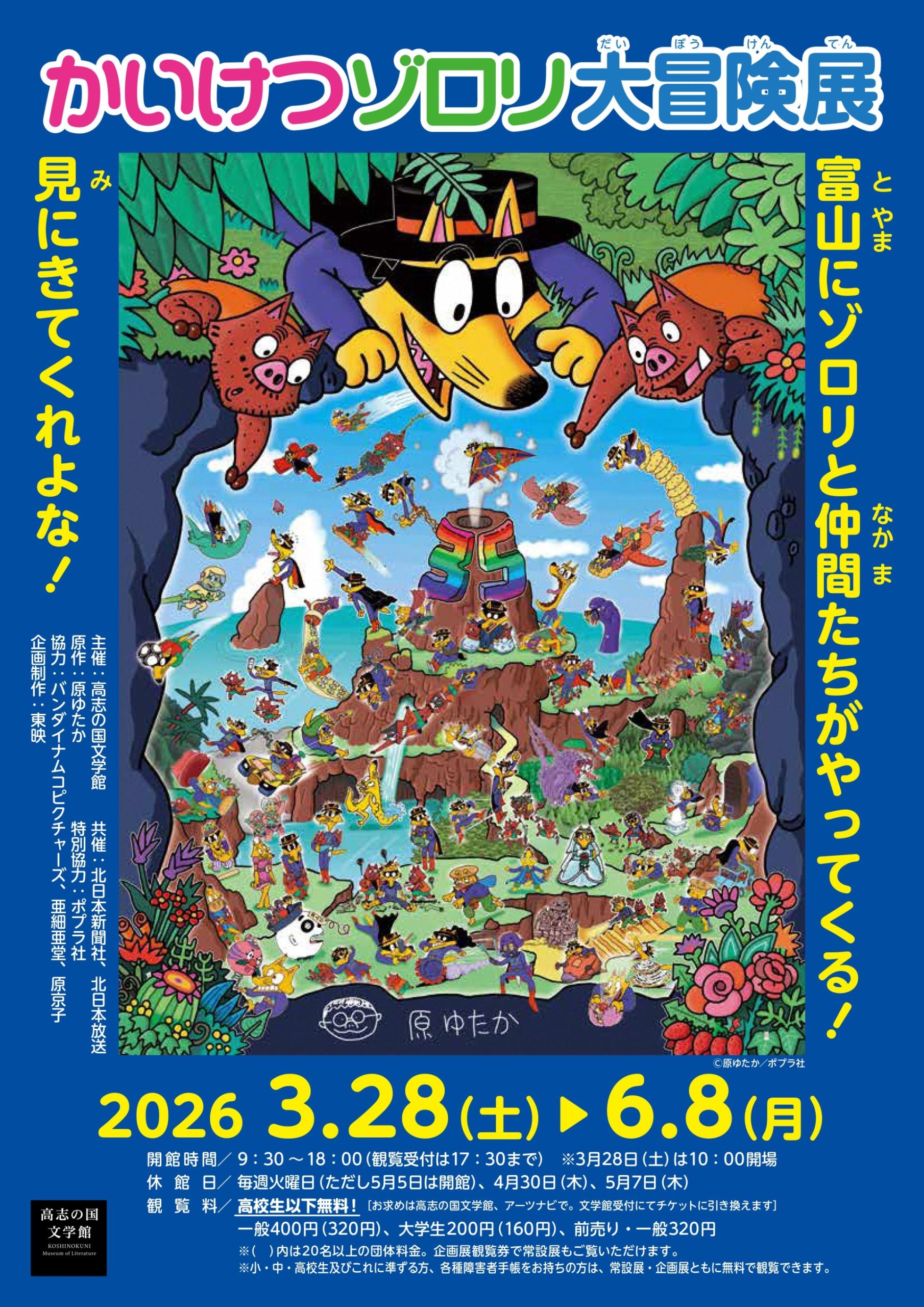 本展では、ゾロリと仲間たちの大冒険を振り返る貴重な原画作品や資料約210点に加え、ゾロリたちが集めた「お宝」を立体作品として紹介します。また原作者・原ゆたかのアトリエ再現や、ゾロリの世界を楽しめるフォトスポットなども登場します。