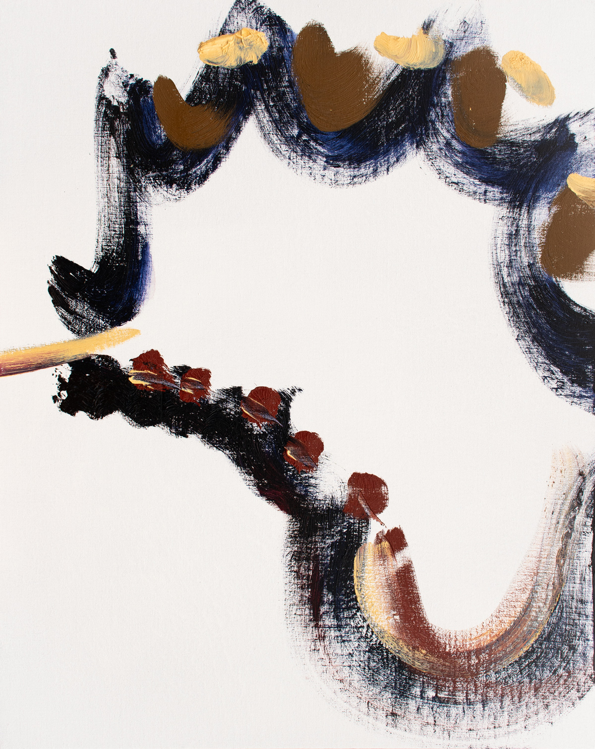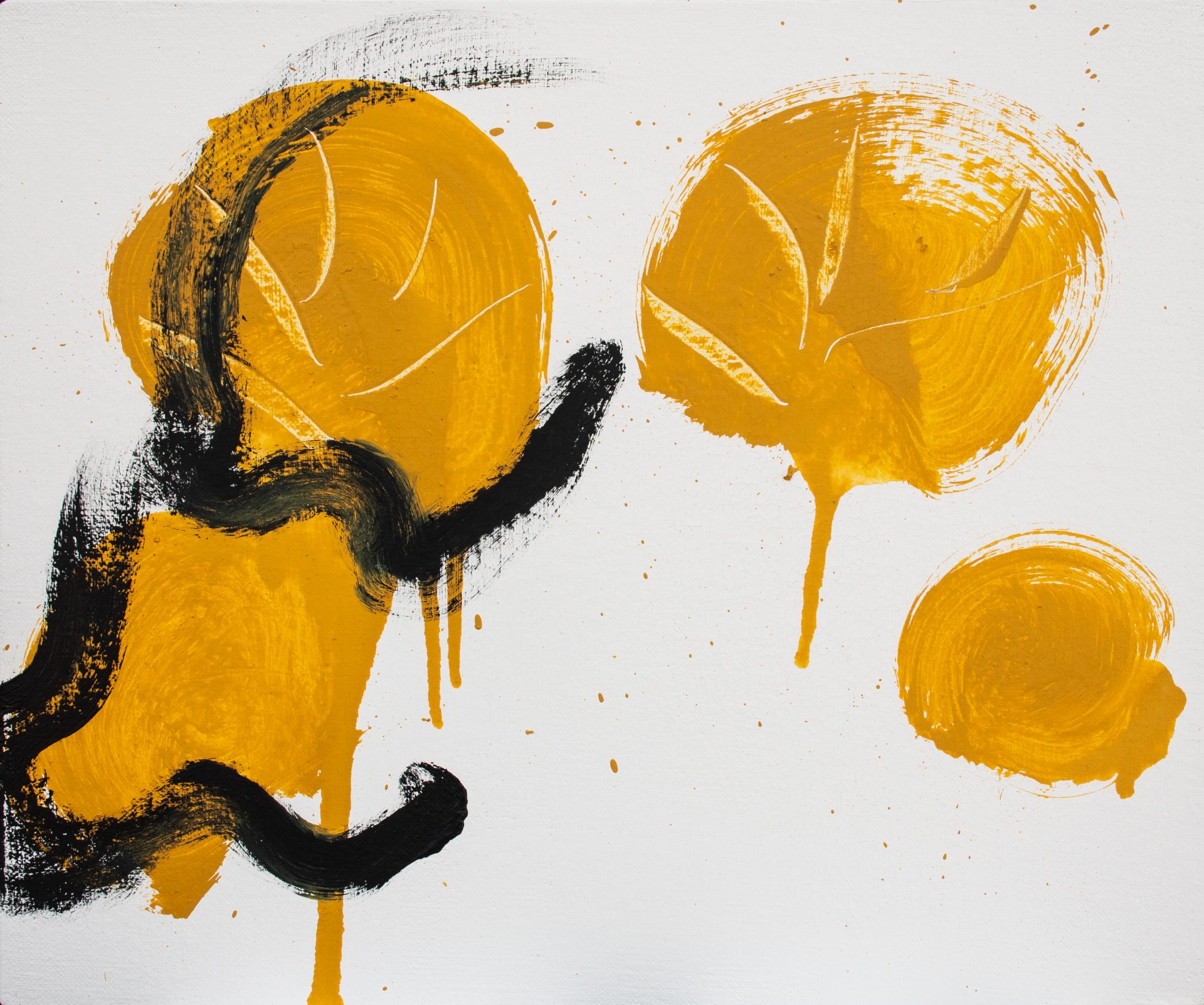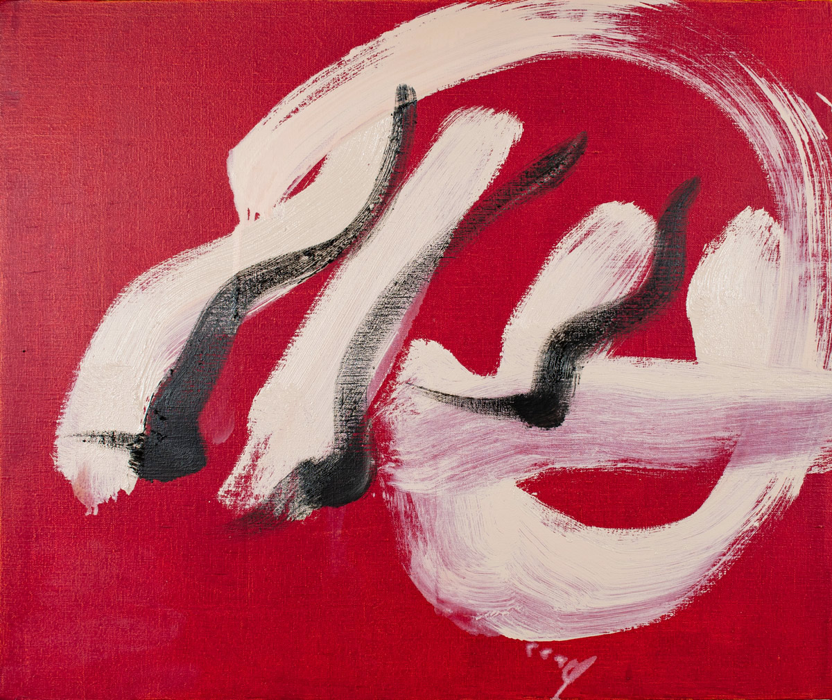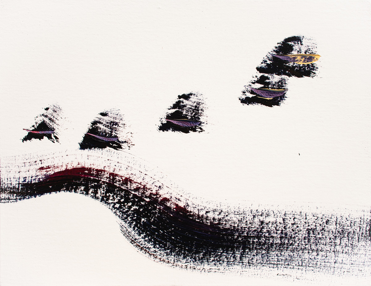 作家は、アトリエでの高度な集中状態において、自己と世界が圧縮されて一体となり、やがて再び分かれていく瞬間に生じる“圧着痕”のような感覚を出発点に制作しています。揮発してしまうその感覚を、消えないうちに素早くなぞり取ることで作品が成立します。そのため画面には、計算された構図や演出よりも、出来事としての線やかたちが優先して現れます。