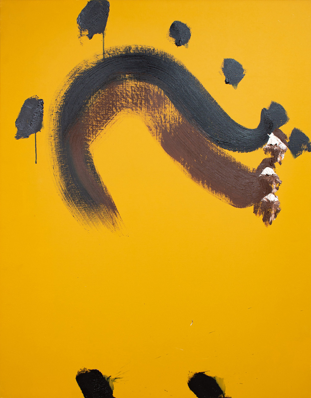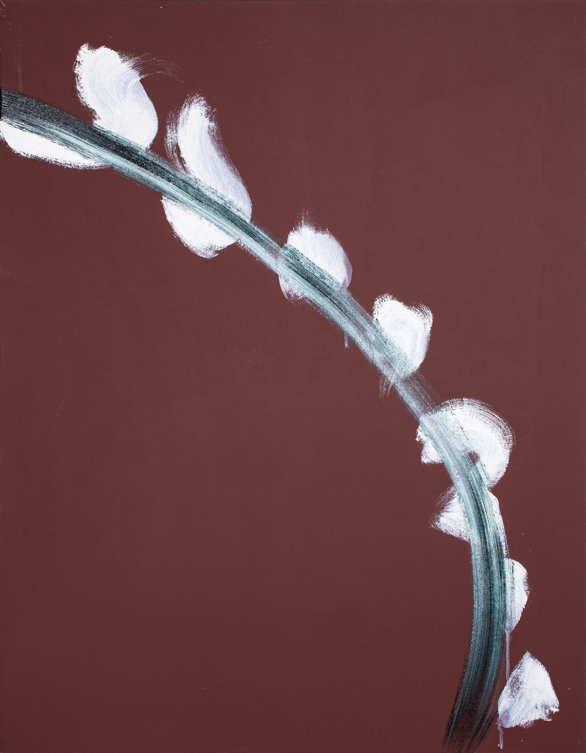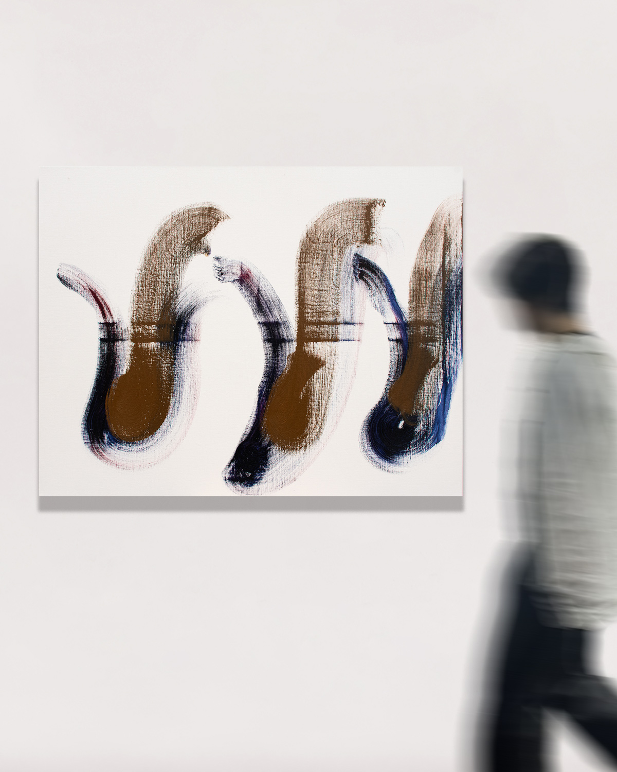作家は、アトリエでの高度な集中状態において、自己と世界が圧縮されて一体となり、やがて再び分かれていく瞬間に生じる“圧着痕”のような感覚を出発点に制作しています。揮発してしまうその感覚を、消えないうちに素早くなぞり取ることで作品が成立します。そのため画面には、計算された構図や演出よりも、出来事としての線やかたちが優先して現れます。