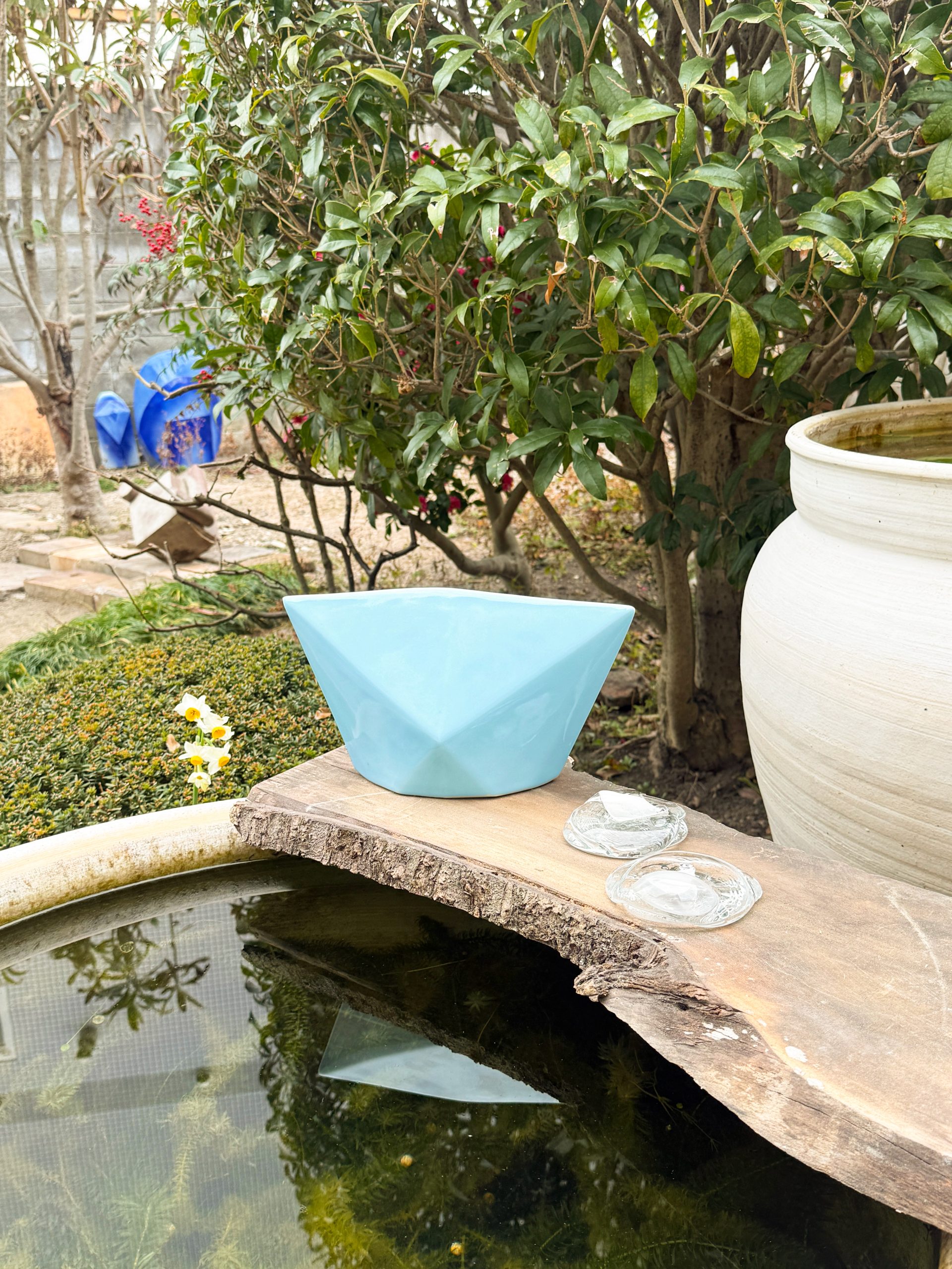 陶土の質量感を活かした造形から出発し、1964年以降は磁器を中心に制作。幾何学的造形や低火度釉による色彩表現、紙型を用いた折形シリーズを経て、現在は青を基調としたモノトーンの世界観を展開。