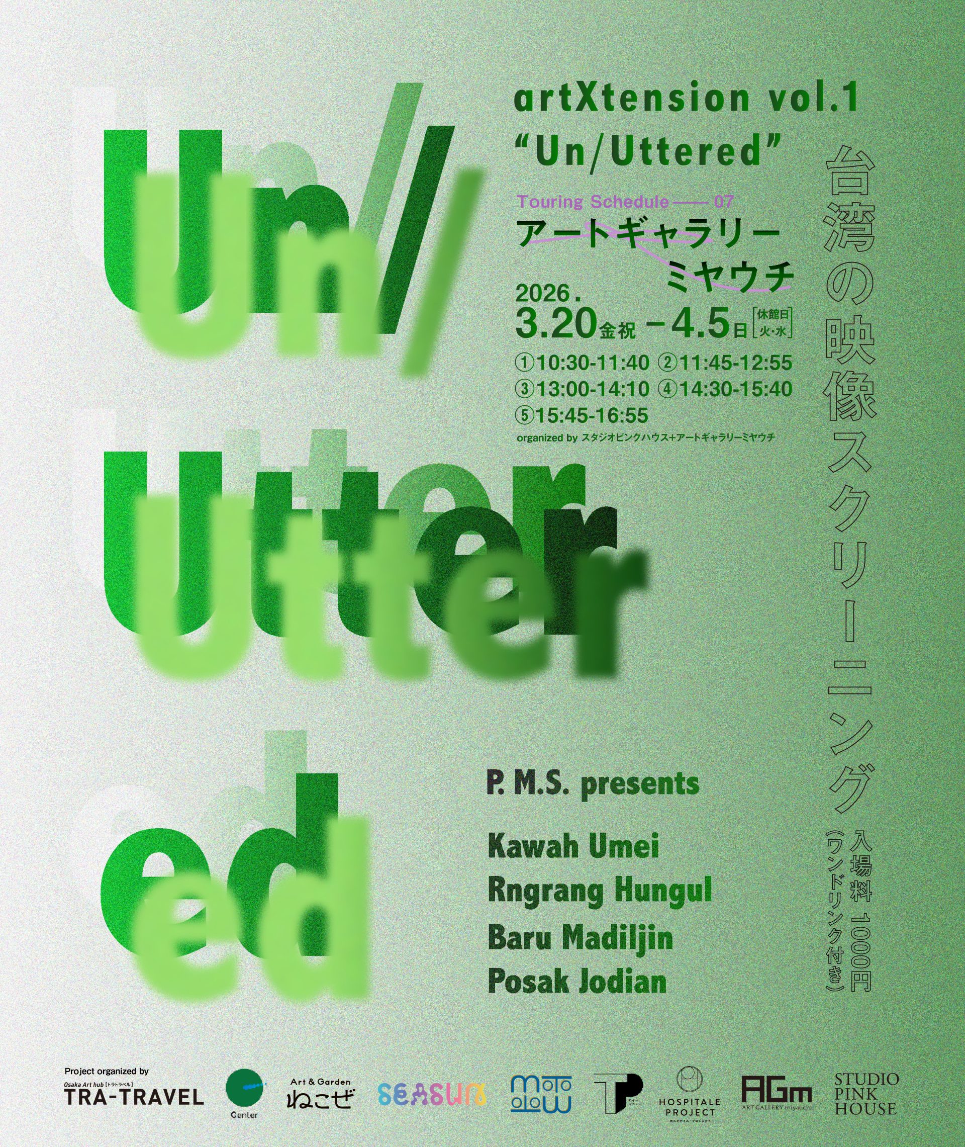 第1弾として、2024年にTRA-TRAVELが、台湾のコレクティブOCAC内のチームP.M.Sと共に企画した、台湾の映像スクリーニング(上映)『Un/Uttered』が国内8箇所のアートスペースに巡回します。広島では、アートギャラリーミヤウチとスタジオピンクハウスとの連携により13日間上映します。