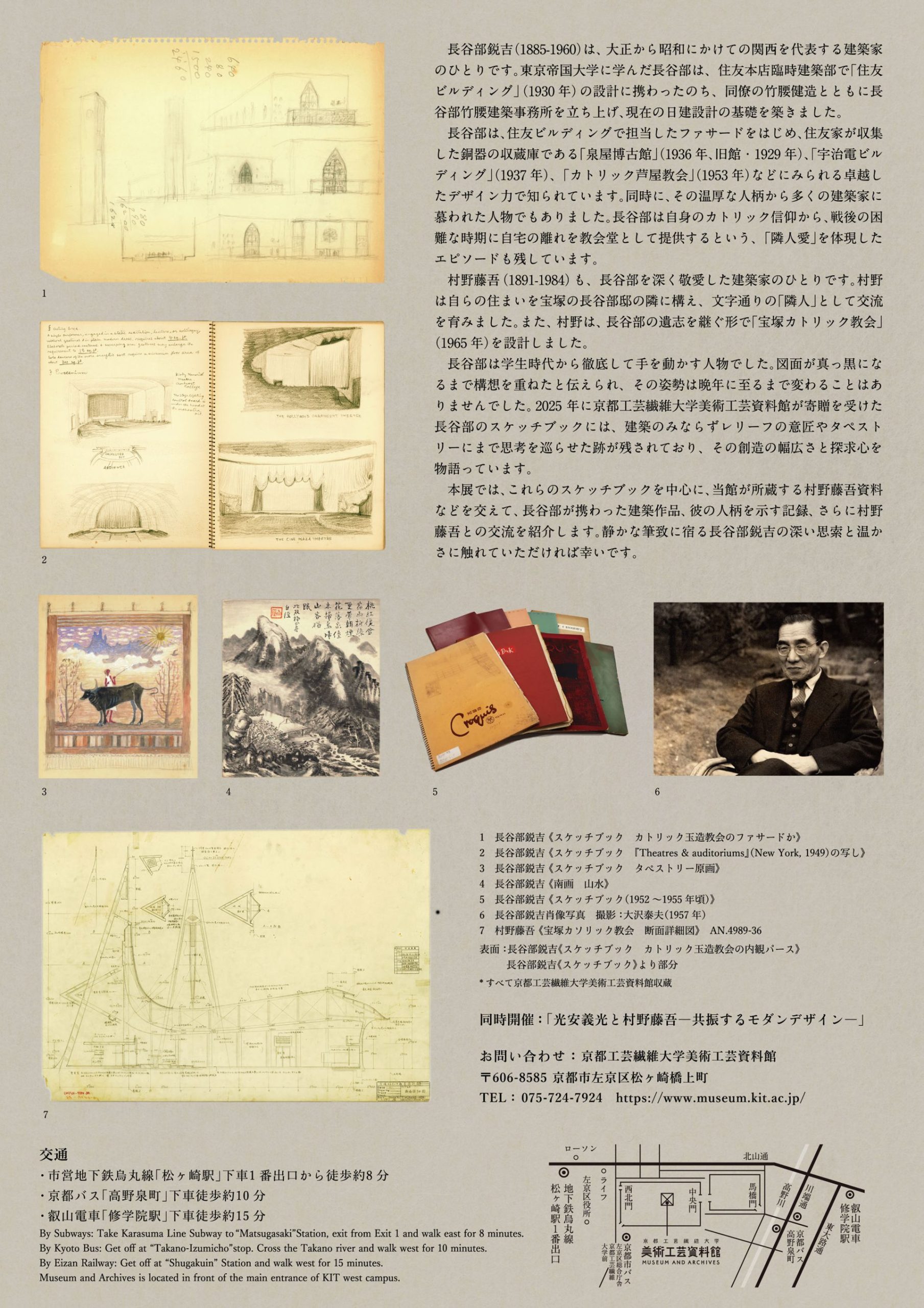 本展では、これらのスケッチブックを中心に、当館が所蔵する村野藤吾資料などを交えて、長谷部が携わった建築作品、彼の人柄を示す記録、さらに村野藤吾との交流を紹介します。静かな筆致に宿る長谷部鋭吉の深い思索と温かさに触れていただければ幸いです。
