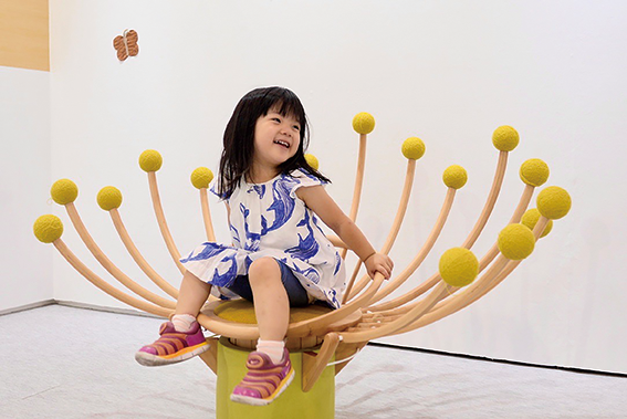 本展は、北海道では初となる本格的な個展です。鍵盤を組み替えて旋律を生み出す《輪唱の〇》や、大人も乗ることができる木製のお椀《くりくりくるり》など、代表作を中心に、多彩な作品を展示します。さらに、初展示となる新作には、釧路産の間伐材が一部使用されています。美術と遊びが響き合い、独特の空間を生み出します。