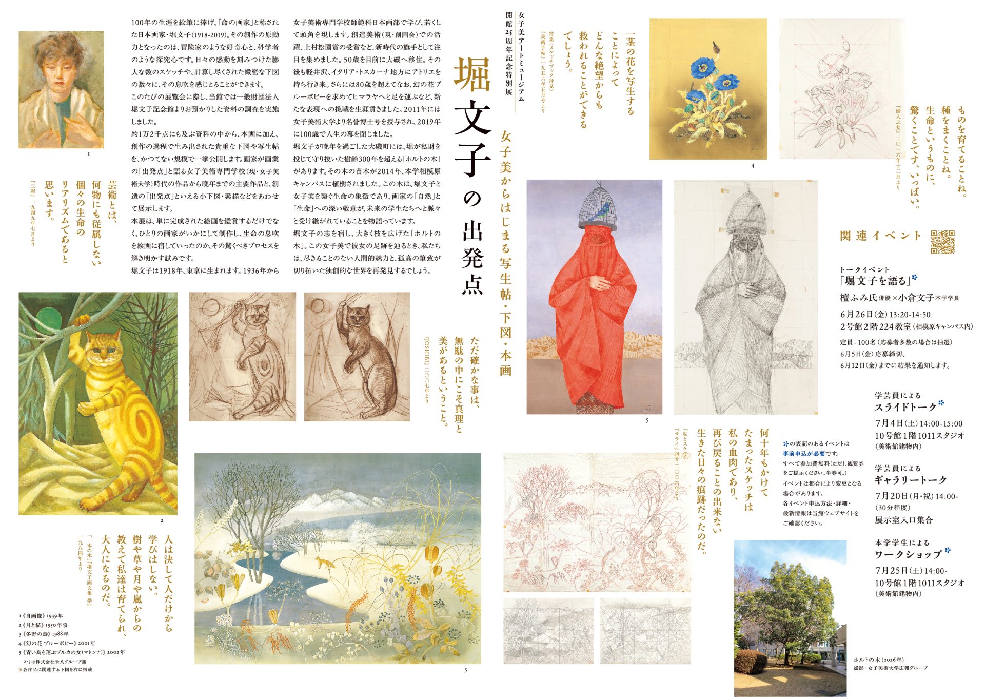 堀文子が晩年を過ごした大磯町には、堀が私財を投じて守り抜いた樹齢300年を超える「ホルトの木」があります。その木の苗木が2014年、本学相模原キャンパスに植樹されました。この木は、堀文子と女子美を繋ぐ生命の象徴であり、画家の「自然」と「生命」への深い敬意が、未来の学生たちへと脈々と受け継がれていることを物語っています。堀文子の志を宿し、大きく枝を広げた「ホルトの木」。この女子美で彼女の足跡を辿るとき、私たちは、尽きることのない人間的魅力と、孤高の筆致が切り拓いた独創的な世界を再発見するでしょう。