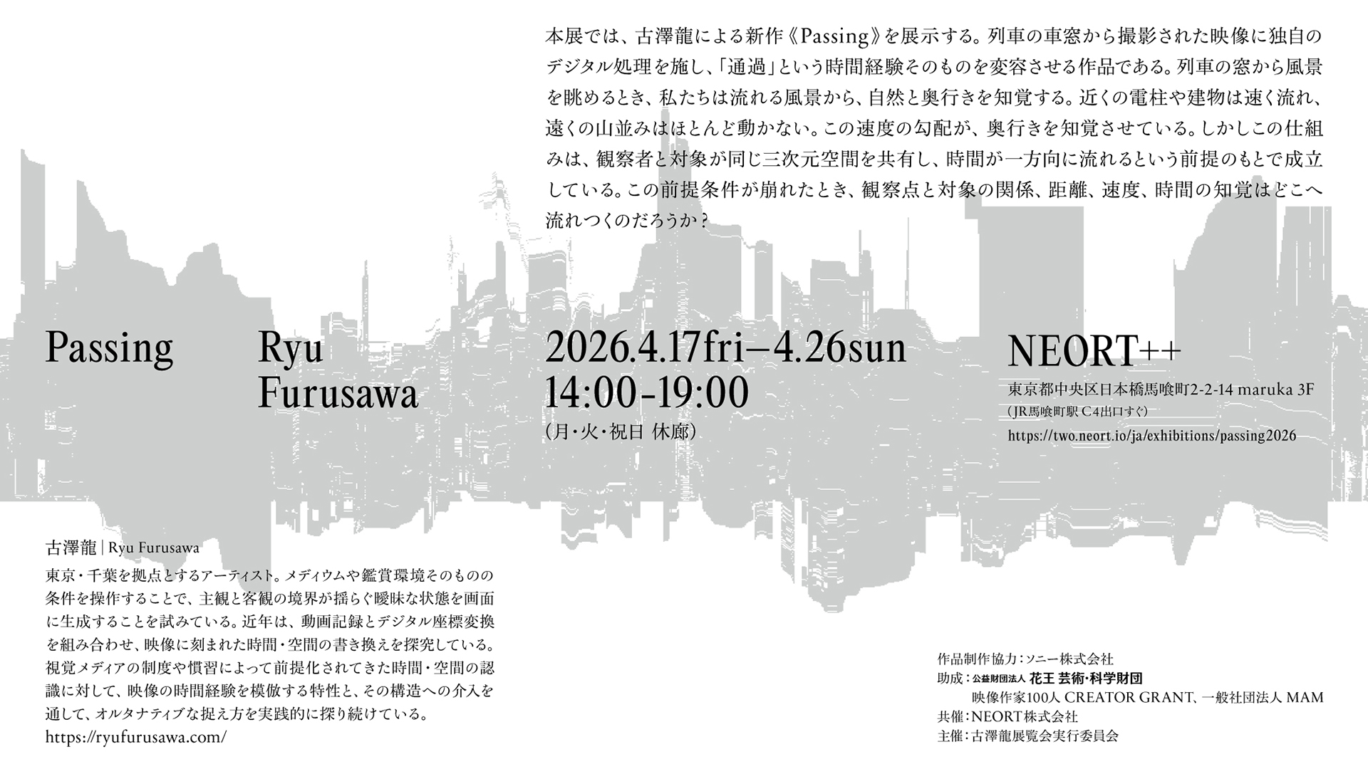 本展では、古澤龍による新作《Passing》を展示する。列車の車窓から撮影された映像に独自のデジタル処理を施し、「通過」という時間経験そのものを変容させる作品である。列車の窓から風景を眺めるとき、私たちは流れる風景から、自然と奥行きを知覚する。近くの電柱や建物は速く流れ、遠くの山並みはほとんど動かない。この速度の勾配が、奥行きを知覚させている。しかしこの仕組みは、観察者と対象が同じ三次元空間を共有し、時間が一方向に流れるという前提のもとで成立している。この前提条件が崩れたとき、観察点と対象の関係、距離、速度、時間の知覚はどこへ流れつくのだろうか?