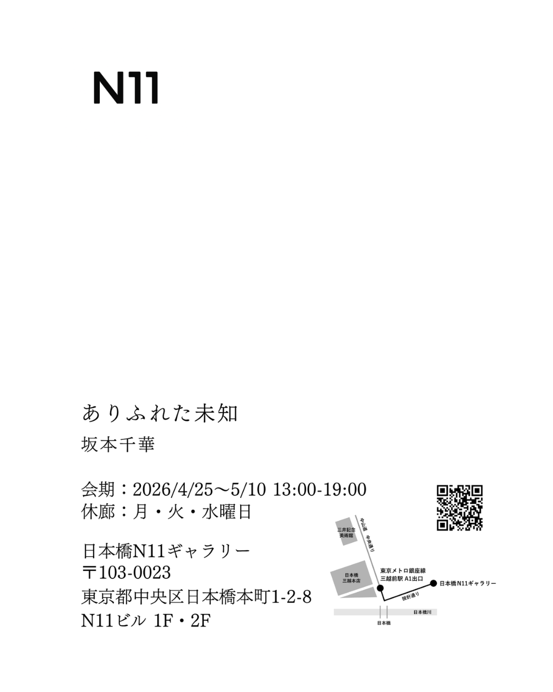 日常の中にある出来事や関係性を組み合わせることで、忘れていた既知を再発見し、そこから思いがけない未知が立ち上がる瞬間。本展では、坂本の視点を通して生まれる「日常×日常」の交差から、新しい発見の体験を提示します。