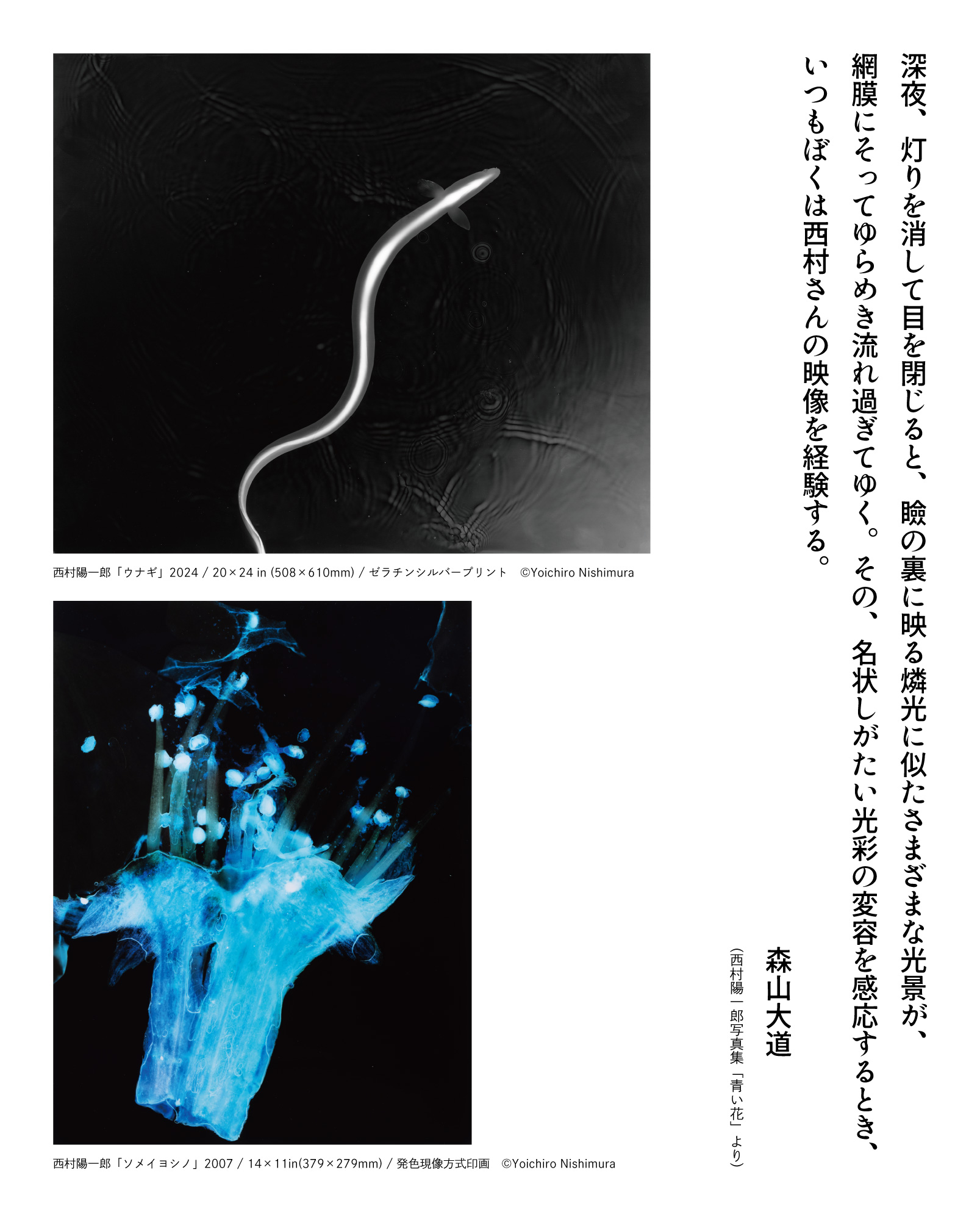 写真家、森山大道がそのイメージを「妖しく官能的で蠱惑に充ちたミクロコスモスへの旅」と表現するように、西村の写真は、現実の断片をどこか夢のような像へと変換する力を持っています。一方で写真評論家の飯沢耕太郎は、その実践をフォトグラムの歴史的系譜の中に位置づけ、写真というメディアの原初と未来を接続する試みとして評価しています。西村の作品は、写真の起源に触れながら、その延長線上に新たな視覚の可能性をひらいていくものです。