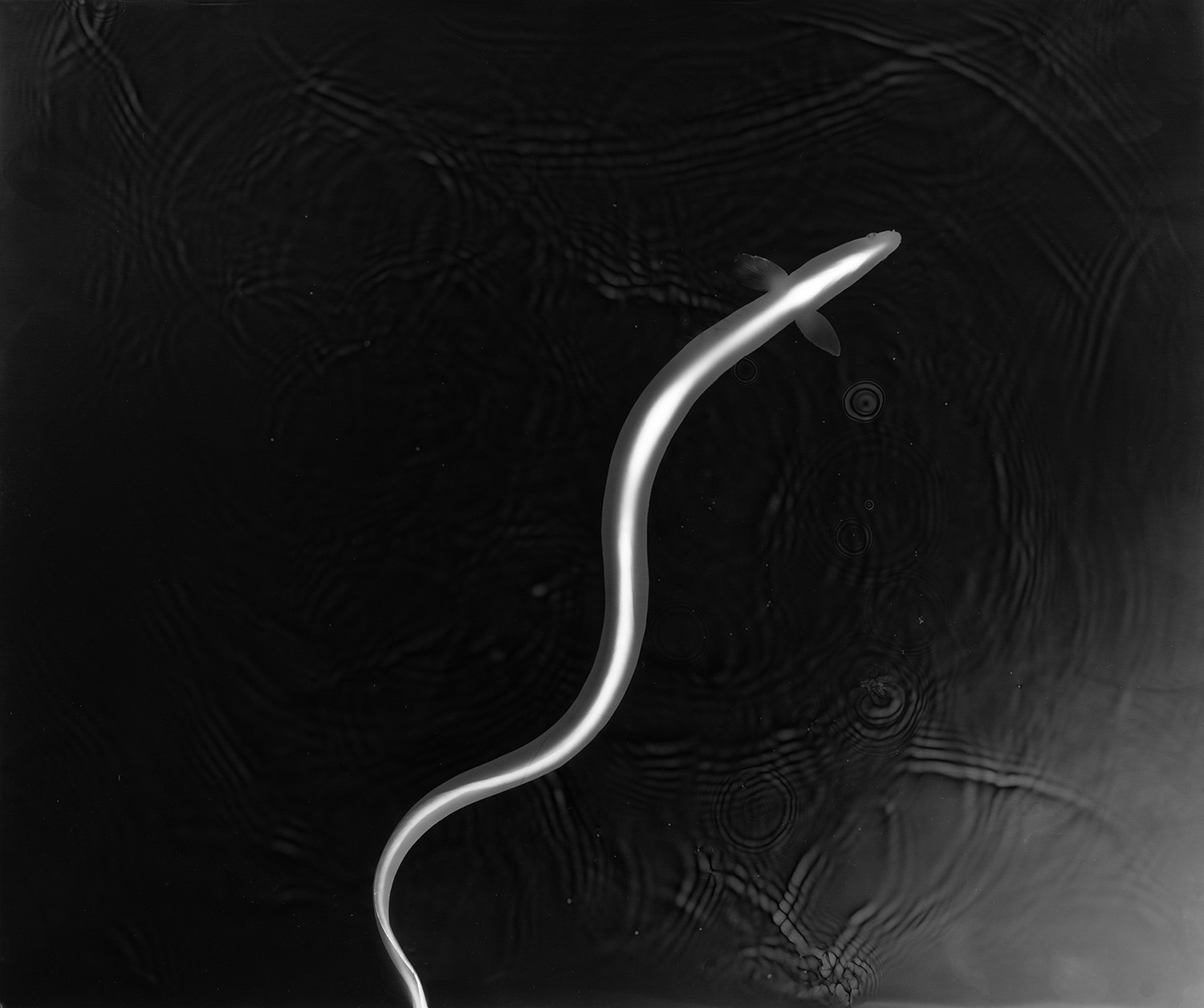 本展ではさらに、西村が長年取り組んできたフォトグラム、そしてスキャングラムによる作品が並びます。これらは約20年前の作品から最新作まで、幅広い年代の中から選ばれています。そこに写し出されるのは、植物や虫、水辺の生き物、人工物といった、私たちの日常に遍在する存在です。しかし、それらが写真の中で見せる表情は、私たちが普段認識しているものとは異なります。