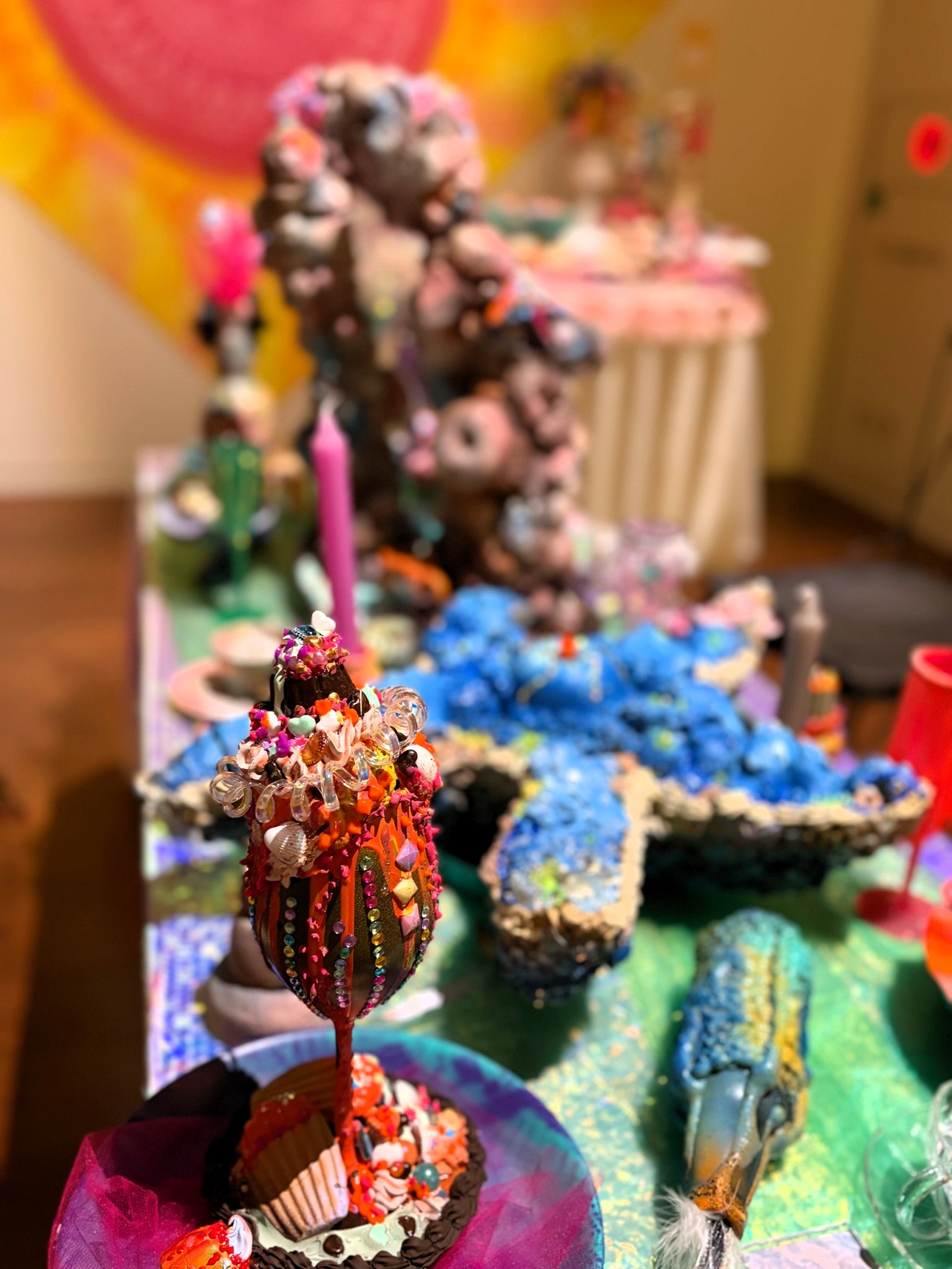 現在好評開催中の企画展「目と感覚でお菓子を味わう~日々を彩るパティスリー marimo ~」が、鑑賞者を招待客としてアート空間に招き入れる不思議な”お茶会”に一部を模様替えしました。夏らしく、海とチョコミントをイメージしたテーブルにつき、お茶会に参加する気分で自らがアート作品の一部になる体験を楽しめます。テーブルには、吉田マリモ氏が生まれ育った京丹後の海のイメージから生まれた、生き物のようなお菓子が並び、ミントチョコ色のテーブルクロスは波のよう。そこに浮かぶカラフルなお菓子のオブジェとともに、来場者もゆっくりと一緒に漂うイメージです。