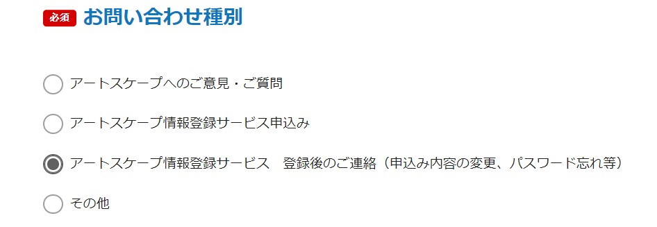 ② お問い合わせ項目の「アートスケープ情報登録サービス 登録後のご連絡(申込み内容の変更、パスワード忘れ等)」にチェック