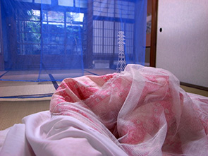 伝統的な和の文化とは対極にあり、景色や町並みのなかに突如現われて調和を乱す無骨な鉄塔や工事現場のクレーンだが、それらはどこにでも見られる典型的な日本の風景でもある。日常となったその風景を、価値判断を留保し、むしろ愛情を持って、すこし引いた視点から眺めるような軽妙さが岩崎にはある。そして仮設性、軽妙さが、蚊帳という簡単な和のしつらえと共鳴する。