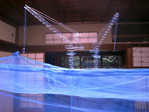 その奥の部屋には、青いネットの蚊帳が吊り下がっている。蚊帳の上部には、同じ手法で蚊帳から引き抜いた繊維でつくったクレーンが2機、立っている。蚊帳と工事現場のイメージが二重写しにされる。
