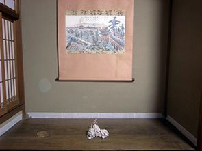 部屋の奥にある床の間には、雑巾を使ってつくった作品が置かれている。この雑巾は、展示の初日、町家の掃除に使って真っ黒になったものである。それを使って半日で即興的につくったのがこの作品である。雑巾からは同じく糸を引き出してつくった松が伸び、小屋が建っている。